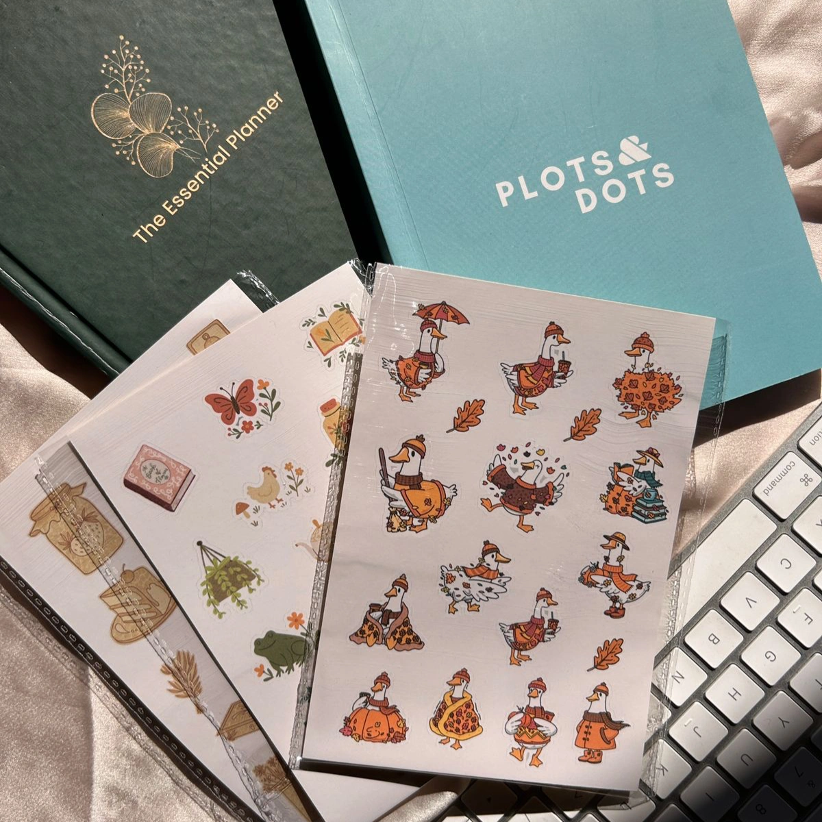 A bundle created for personal development and creative planning. It includes the Essential Planner, Plots & Dots, and 3 Sticker Sets a combination that supports goal-setting, habit building, dotted-page creativity, journaling, and aesthetic motivation. It gives structure while leaving room for exploration.