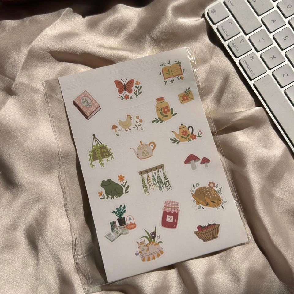 This sticker sheet features adorable garden-themed illustrations from butterflies, chickens, plants, mushrooms, herbal tea pots, to jam jars and reading corners. Perfect for: