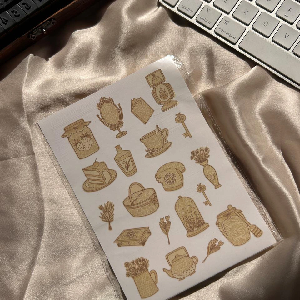 This sheet includes antique-inspired icons like rotary phones, mirrors, tea cups, dried flowers, books, jars, baskets, keys, candles, and more. Perfect for: