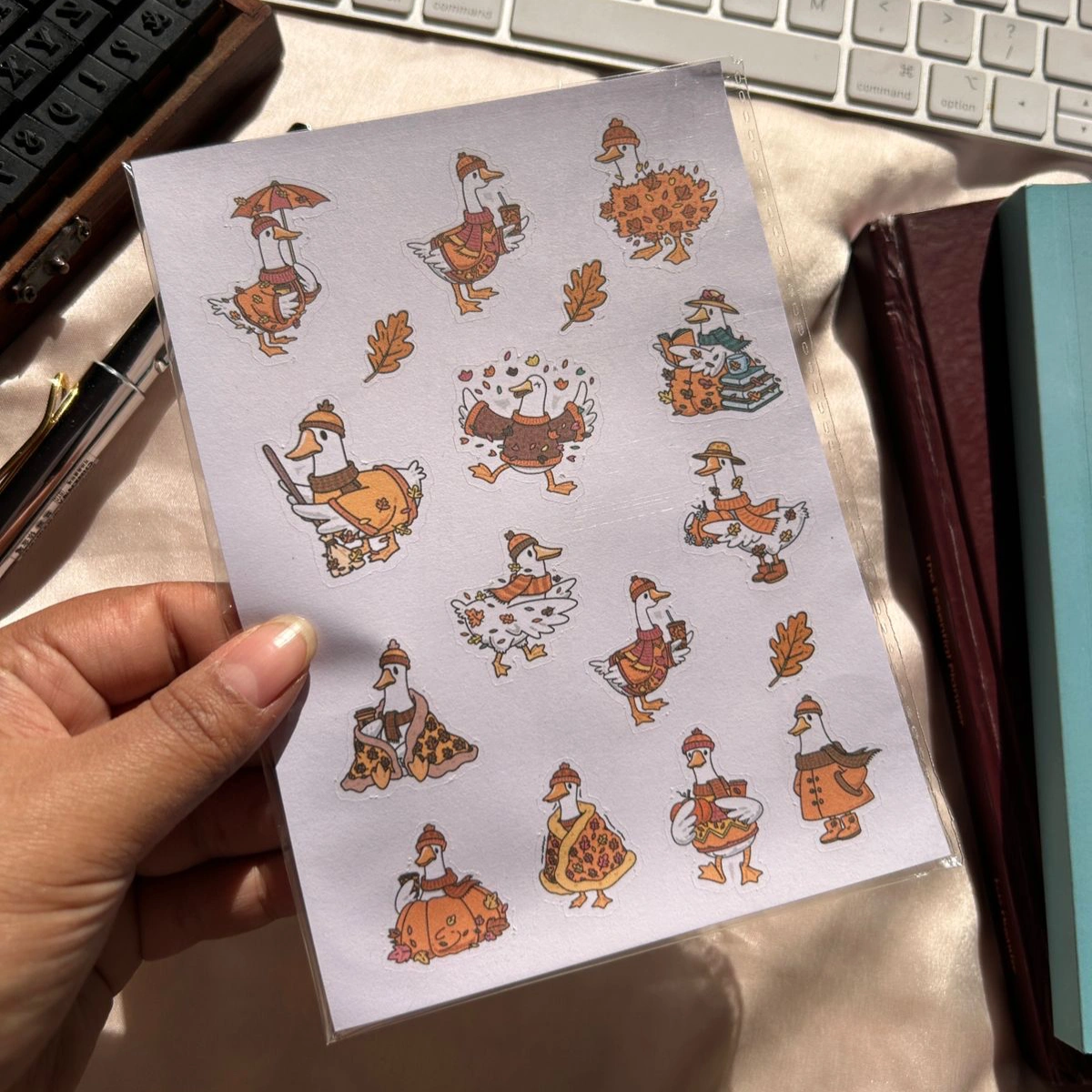 Bring charm and warmth to your planners, journals, and crafts with this adorable Autumn Goose Sticker Sheet. Each sticker features a delightful illustrated goose dressed in cozy fall outfits—think sweaters, scarves, pumpkin costumes, books, and crunchy leaves. Perfect for adding a seasonal touch to your pages, these stickers capture the spirit of autumn in a playful and heartwarming way.