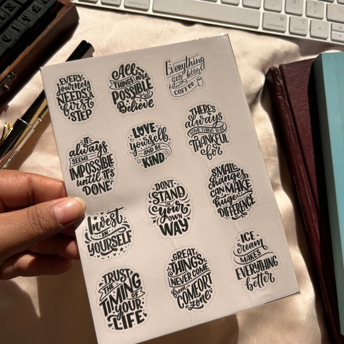 Our Motivational Quote Sticker Sheet features 12 beautifully hand-lettered quotes designed to inspire your daily routine. Perfect for planners, journals, scrapbooks, or vision boards — each sticker is printed on high-quality matte paper for a clean, aesthetic look.